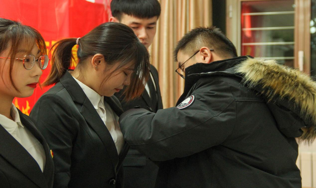 ok138cn太阳集团529学生第三党支部书记古琛同志为新发展党员佩戴党徽