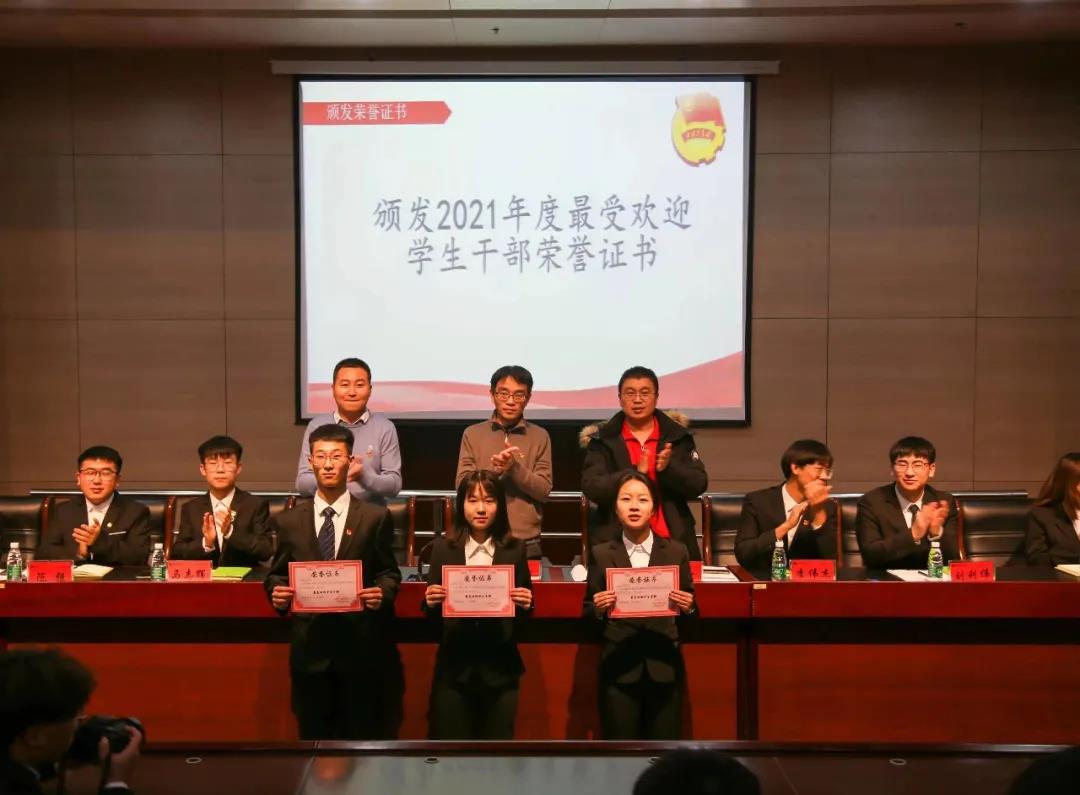 在表彰大会现场,进行了本年度最受欢迎学生干部评选。经过现场全体同学无记名线上投票,最终团总支文体部毕温薪、学生会学习部杨佳丽、青年传媒中心短视频部康佳琪三名同学荣获了“2021年度最受欢迎学生干部”荣誉称号。