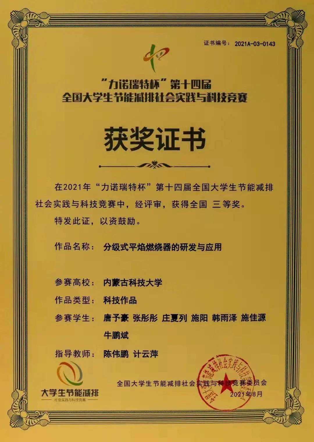 本届竞赛中,我校ok138cn太阳集团529唐予豪等同学的作品《一种分级式平焰燃烧器的研发与应用》、刘嘉晨等同学的作品《超静音无风空调舒适系统》、机械工程学院杨统勋等同学的作品《智能垃圾分类装置》、刘延振等同学的作品《烟气处理系统》、康寿臻等同学的作品《基于物联网+的智能光伏板清扫机》荣获了全国三等奖。