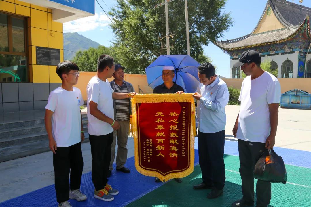 7月30日,青海省海东市循化县道帷藏族乡贺龙堡村党支部书记周代才让、贺塘村党支部书记张学均、贺庄村党支部书记周加、比隆村党支部书记桑斗合及部分党员代表,怀着对“梦圆青海”支教团的关怀,来到了道帷藏族乡贺塘小学慰问了支教团全体成员,实地察看了支教队员们的工作、学习、生活环境,详细了解他们支教的情况,并为全体支教团成员送去了“热心援教献真情·无私奉献欲新人”的主题锦旗,表达了对支教团关心与感谢。