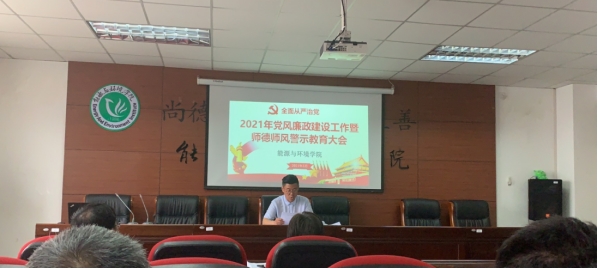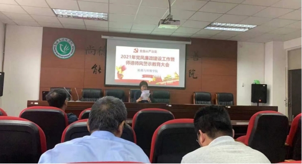 为深入推进党史学习教育,传达学校全面从严治党工作会议精神,进一步强化党风廉政和师德师风建设,引导干部教师廉洁从政从教,加强规范教师职业行为,2021年5月14日下午在秋实楼B405召开2021年党风廉政建设会议暨师德师风警示教育大会,院党委书记张鑫主持本次会议,全院教职工参加。
