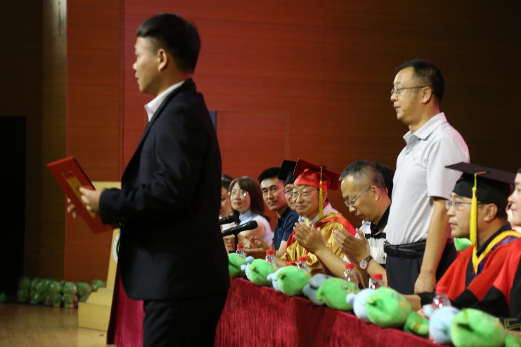 在典礼现场,主席台就座的领导、嘉宾为所有考取硕士研究生同学颁发荣誉证书和纪念品。