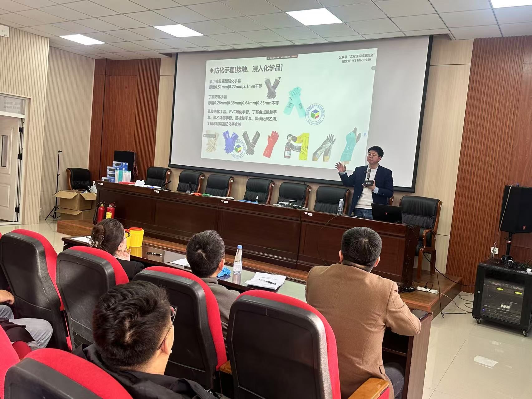 培训讲座上,屈文军老师向学生们介绍了实验室安全管理及检查的要求,介绍了实验室气瓶、危化品、仪器和水电等方面的安全知识,分享了关于实验室安全隐患及应急处理流程,现场演示了安全防护用品的使用方法。通过讲解,师生们对危化品管理的科学方法和有效防护手段有了更为全面的了解。