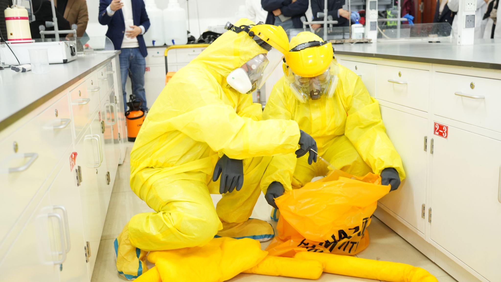 随后,在逸夫楼E区一楼化学与化工学院实验室进行了现场应急演练。演练根据实验室化学品使用情况及实验室真实环境,模拟了突发实验室安全事件。演练按照现场伤情处置、受伤人员互救、人员疏散、现场警戒封锁、逐级事故上报、应急救援人员个人防护穿戴、排查消除危险源、洗消除污、现场恢复等应急处置流程开展。各环节安排紧凑,学生积极参与,有序进行。配合专家实时解说,让师生通过现场沉浸式的观摩体验,真切感受到演练对于现场正确处置的重要性,有效提升了师生的实验室安全意识。