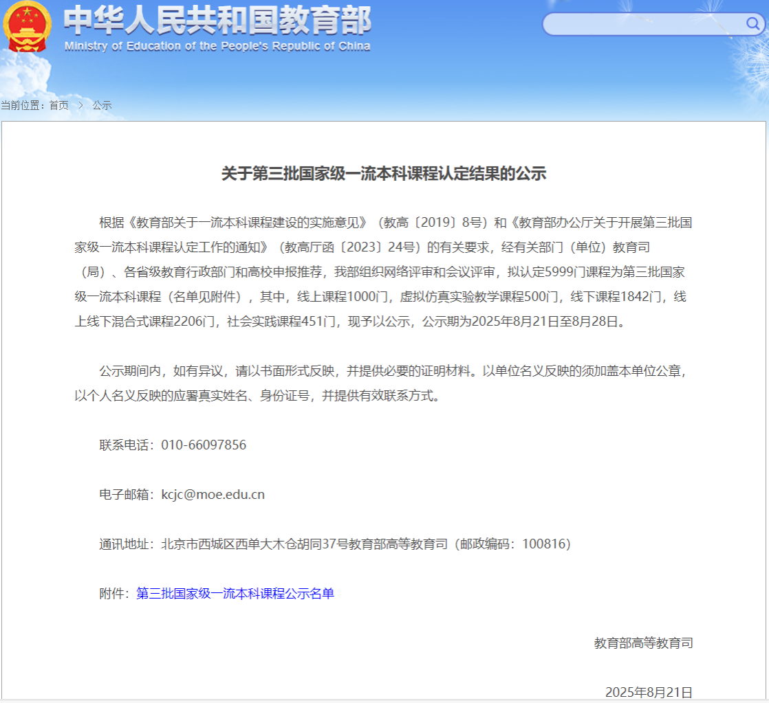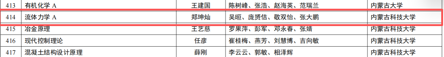 8月21日,教育部公布了《关于第三批国家级一流本科课程认定结果的公示》,我院郑坤灿教授负责的《流体力学A》课程被认定为“国家级线下一流本科课程”,这是学院“十四五”期间在国家级本科课程建设方面取得的重大突破,为学院教学改革和发展注入强劲动力。 《流体力学A》作为我院建筑环境与能源应用工程、给排水科学与工程、能源与动力工程等专业的学科基础课程,此次成功入选国家级一流课程,标志着学院相关专业的建设取得卓越成效。同时,这也是学院积极深化教育教学改革,着力打造优质课程,创新人才培养模式的成果。未来,学院将继续落实“立德树人”根本任务,着力发挥一流课程示范引领作用,大力推进课程建设与教学改革,促进学院教育教学水平与人才培养质量稳步提升。