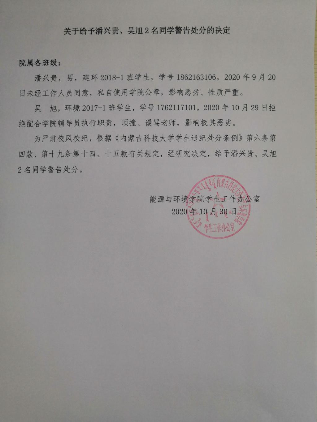 关于给予潘兴贵、吴旭等2名学生警告处分的决定