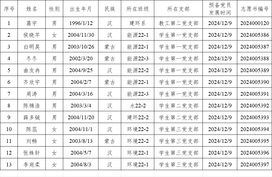 经过一年的教育和考察,葛宇、侯晓芊、白明昊、冬冬、曲友冉、齐欣宇、周涛、陈锦浩、薛多铖、陈蕊、刘畅、张姝轩和李宛柔共十三位同志预备期将满,学院各党支部拟在近期召开党员大会讨论他们的转正问题。为进一步增强发展党员工作的透明度,严格发展党员工作程序,根据《中国共产党章程》和《中国共产党发展党员工作细则》,现将近期拟转正的预备党员情况予以公示。