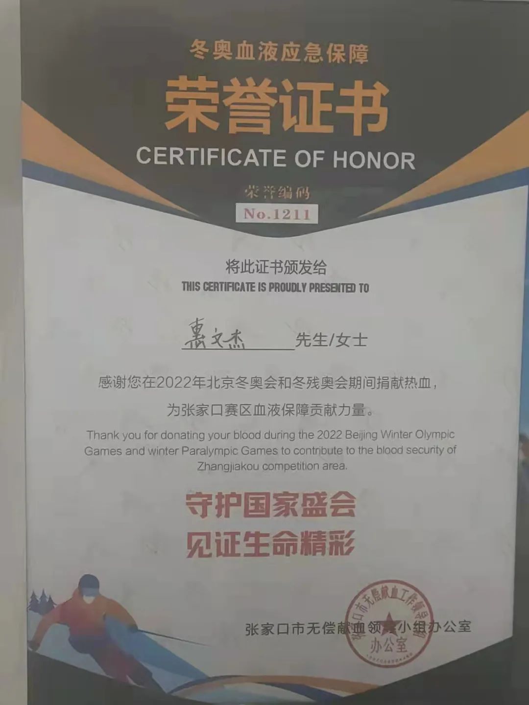 回顾北京冬奥会志愿者的选拔历程,经历过的每一次培训、每一项考核都让惠文杰历历在目。他说:“2021年暑假我进入了张家口市城市志愿者的面试群,记忆中是在一个周四的下午,我通过了张家口市万全区团委几轮的面试,经过阶段性培训后幸运地被选为了2022年北京冬奥会张家口赛区的城市志愿者。”